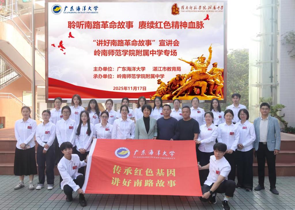 2025年11月17日清晨,广东海洋大学“讲好南路革命故事”宣讲团的20名成员带着南路革命的赤诚火种,走进岭南师范学院附属中学初一、高一全部新生班级,以一堂特别的“红色晨课”在青少年心中点燃不灭的星火。