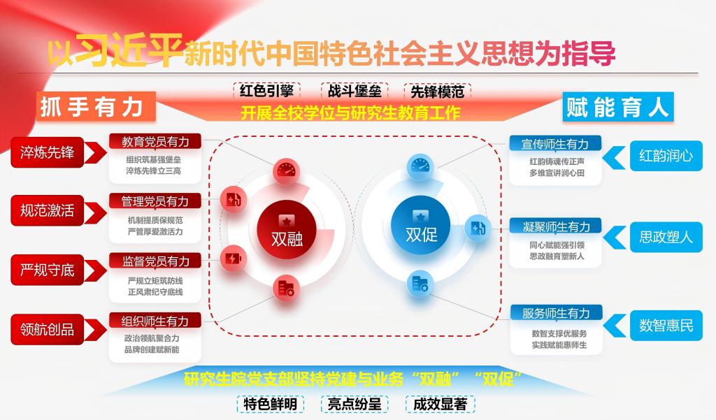 坚持党建与业务“双融双促”,以高质量党建引领研究生教育高质量发展。研究生院党支部严格按照省级样板支部建设标准,扎实推进党支部标准化、规范化建设,严格落实“第一议题”“三会一课”等制度,深化“四育五新”党建与业务双融双促模式,积极开展“跨支部共建”等活动,党建工作成效显著,顺利通过省级样板支部验收,党建引领示范更加有效,铸魂育人根基更加坚强,为学校党建工作树立了标杆和榜样。