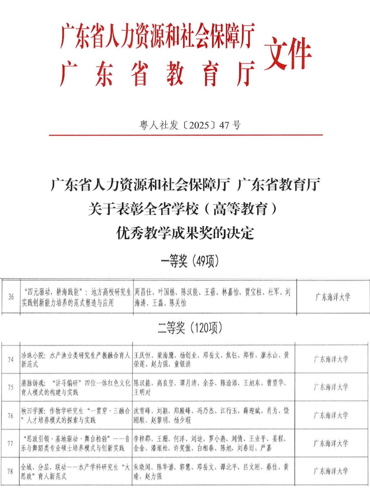 构建红色基因与研究生教育深度融合的育人体系。深耕“讲好南路故事、赓续红色血脉、培育时代新人”实践模式,成功入选中国学位与研究生教育学会农林工作委员会管理工作典型案例,为全国农林院校红色育人与研究生教育管理工作提供可复制、可推广的“海大方案”。陈汉能同志荣获“南粤优秀教育工作者”称号,为学校研究生教育工作者树立了标杆和典范。